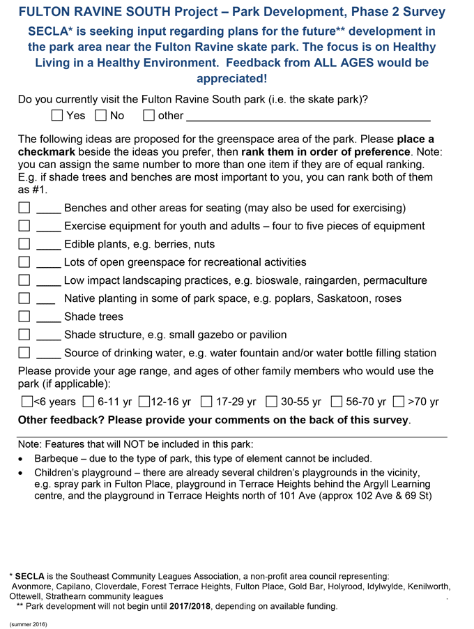 FUNDRAISING efforts in support of completion of the parking lot (an outstanding element of the initial phase of the park development) are in progress. You can contribute to this project through a personal or business donation. Donations over $20 are eligible for a tax receipt. Cheques must be made payable to the City of Edmonton, and must reference the SECLA Fulton Ravine South Park Development project.