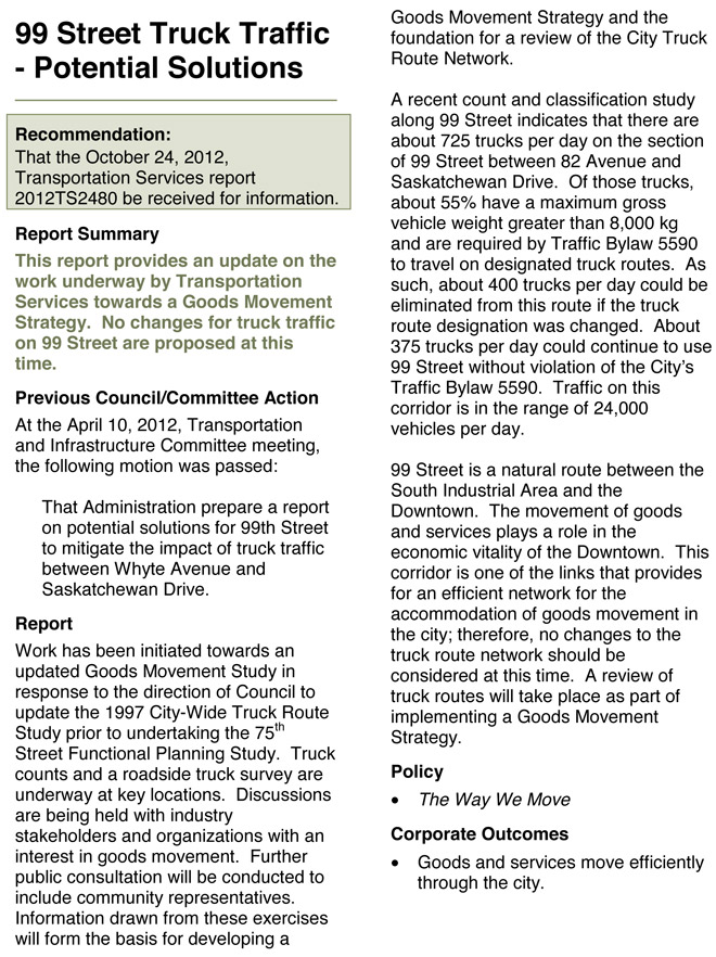 Transportation Planning13th Floor, Century Place 9803 – 102A Avenue Edmonton, AlbertaT5J 3A3Telephone780-496-1795Email99th Street Truck Traffic
